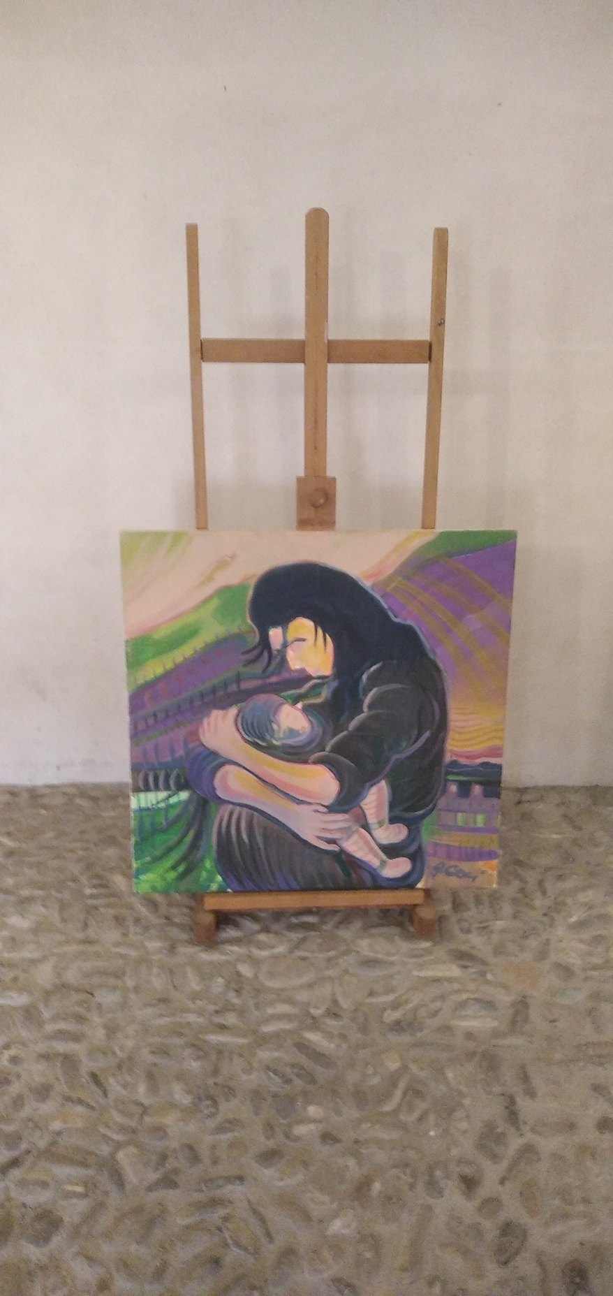 avvolto teneramente; una pietà moderna. Sullo sfondo un cielo dai colori